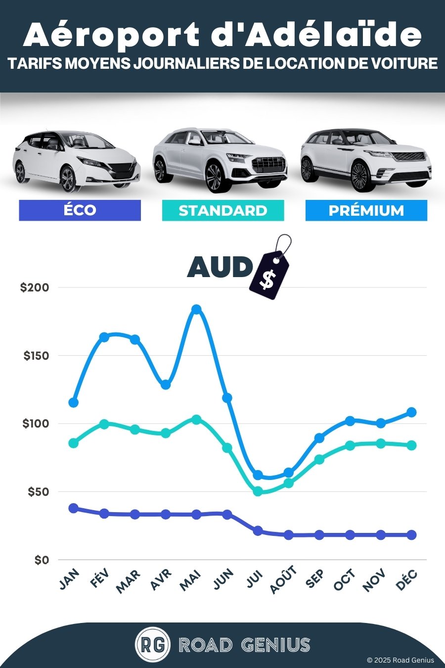En moyenne, les locations de voitures à l’aéroport d’Adélaïde (ADL) coûtent environ 100 AUD par jour, les offres les moins chères démarrant à 18 AUD par jour.
