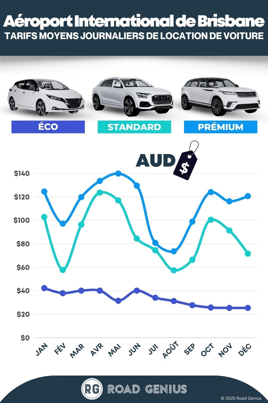 En moyenne, les locations de voitures à l’aéroport de Brisbane (BNE) coûtent environ 103 AUD par jour, les moins chères étant proposées à partir de 25 AUD par jour.