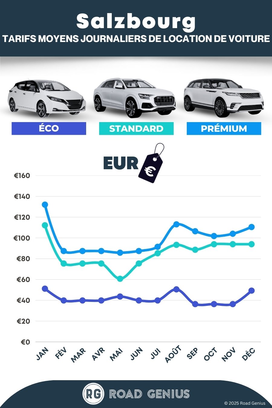En moyenne, la location de voiture à Salzburg coûte environ 76 € par jour, les offres les moins chères étant disponibles dès 36 € par jour.