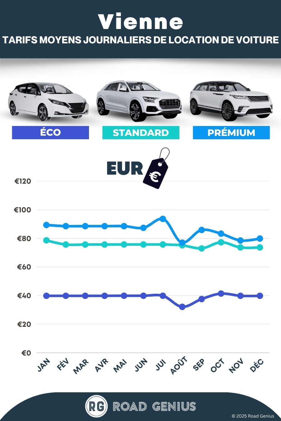 En moyenne, la location de voiture à Vienne coûte environ 67 € par jour, les offres les moins chères étant disponibles dès 32 € par jour.