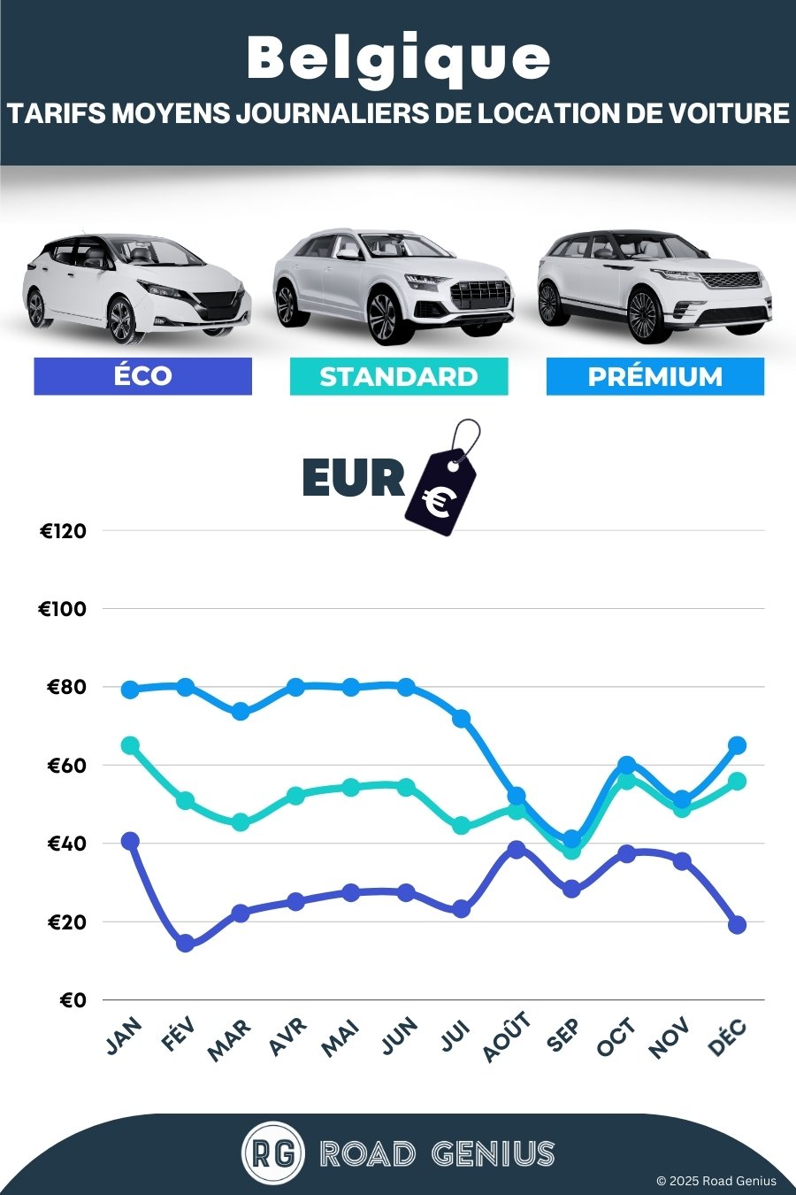 En moyenne, la location de voiture en Belgique coûte environ 49 € par jour, les offres les moins chères étant disponibles dès 14 € par jour.