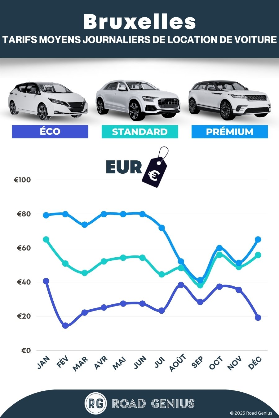 En moyenne, la location de voiture à Bruxelles coûte environ 49 € par jour, les offres les moins chères étant disponibles dès 14 € par jour.