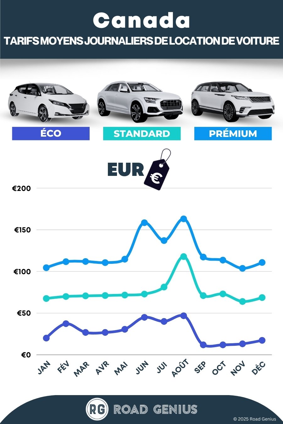 En moyenne, la location de voiture au Canada coûte environ 75 CAD par jour, les offres les moins chères étant disponibles dès 12 CAD par jour.
