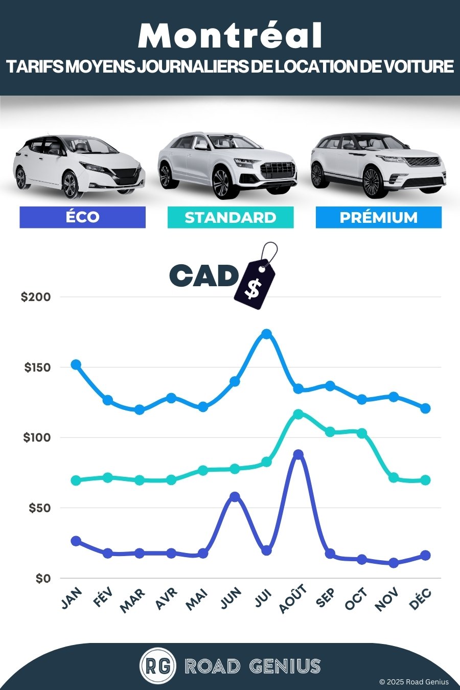 En moyenne, la location de voiture à Montreal coûte environ 81 CAD par jour, les offres les moins chères étant disponibles dès 11 CAD par jour.