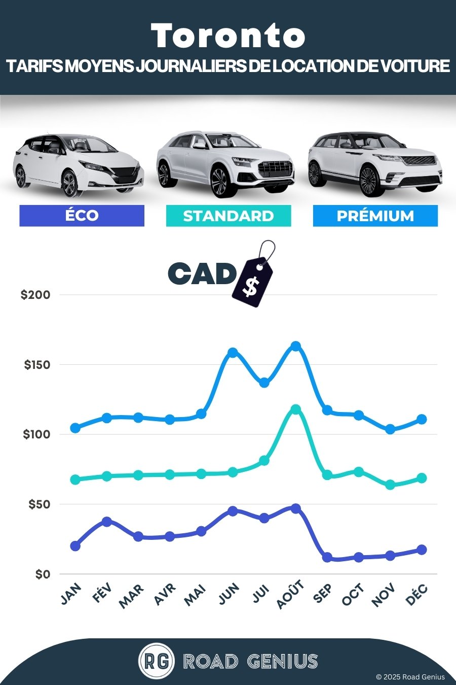 En moyenne, la location de voiture à Toronto coûte environ 75 CAD par jour, les offres les moins chères étant disponibles dès 12 CAD par jour.