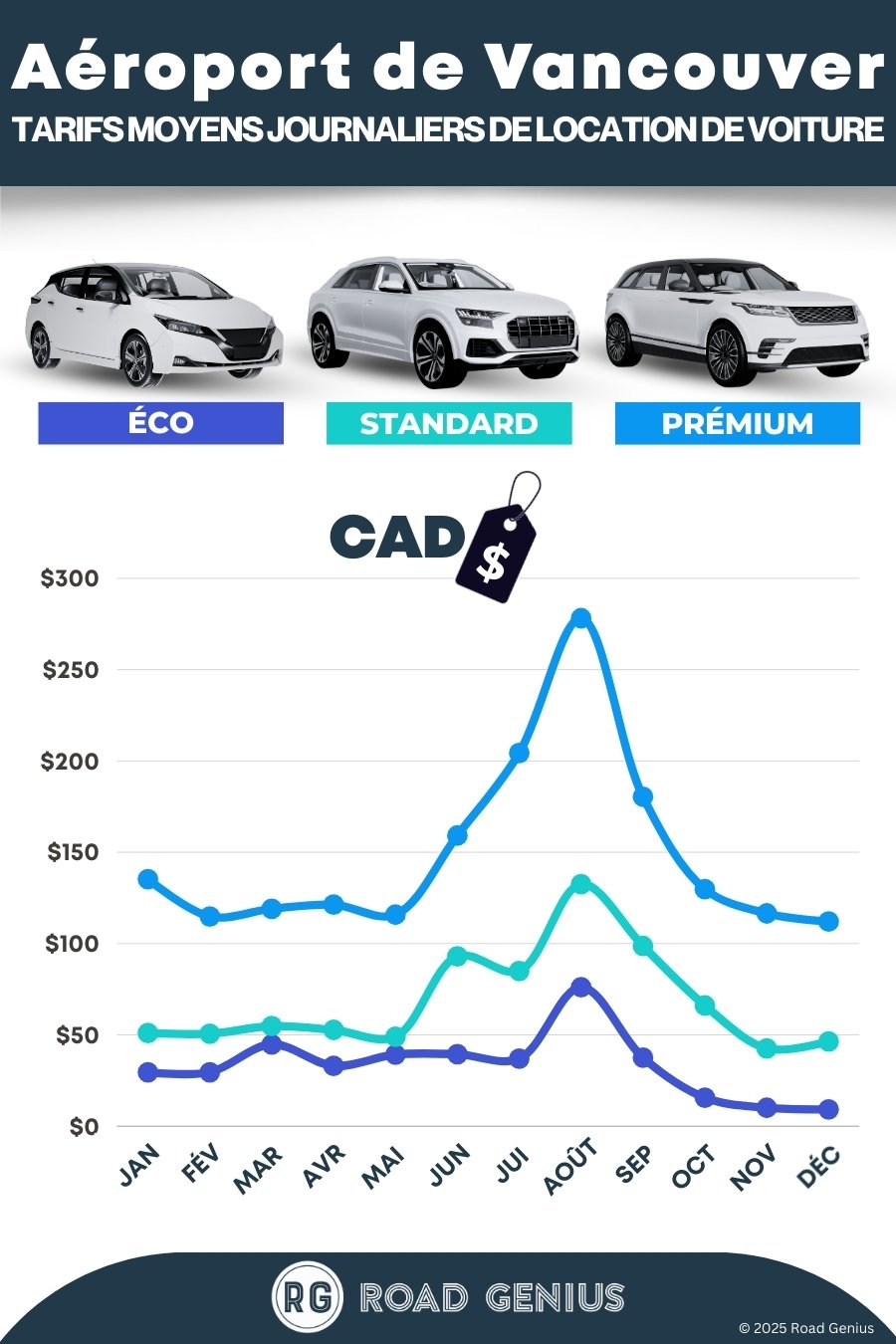 Comparez une prise en charge à l'aéroport et en centre-ville. L'aéroport YVR applique des frais supplémentaires d'environ 13 % à 17 %. Les tarifs de base en centre-ville sont souvent plus bas, mais n'oubliez pas de compter le prix du taxi depuis l'aéroport (environ 35 à 40 $CAD). Pour une location d'une semaine en catégorie économique, la différence peut atteindre 50 à 70 $CAD, surcoût que le prix du taxi peut donc compenser.