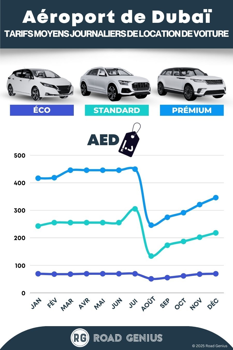 En moyenne, la location de voiture à l’aéroport de Dubaï coûte également environ 224 AED par jour, les offres les moins chères étant disponibles dès 51 AED par jour.