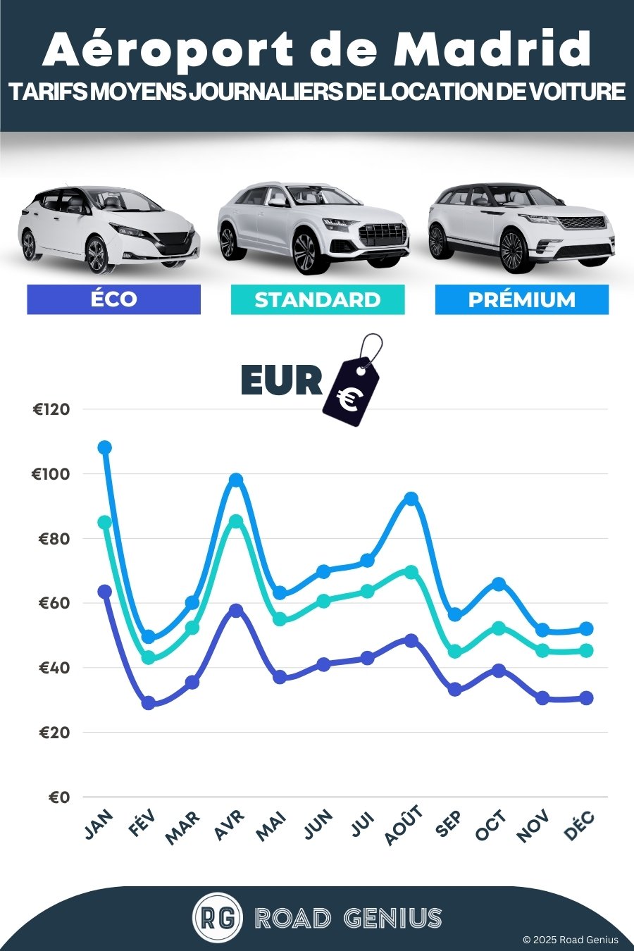 En moyenne, la location de voiture à Madrid Airport coûte environ 56 € par jour, les offres les moins chères étant disponibles dès 29 € par jour.