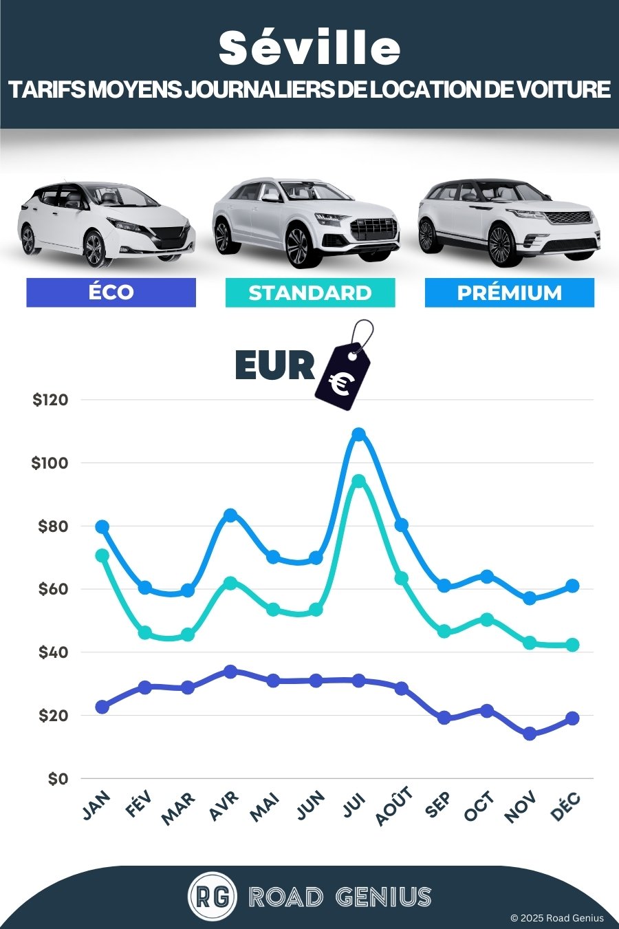 En moyenne, la location de voiture à Seville coûte environ 51 € par jour, les offres les moins chères étant disponibles dès 14 € par jour.