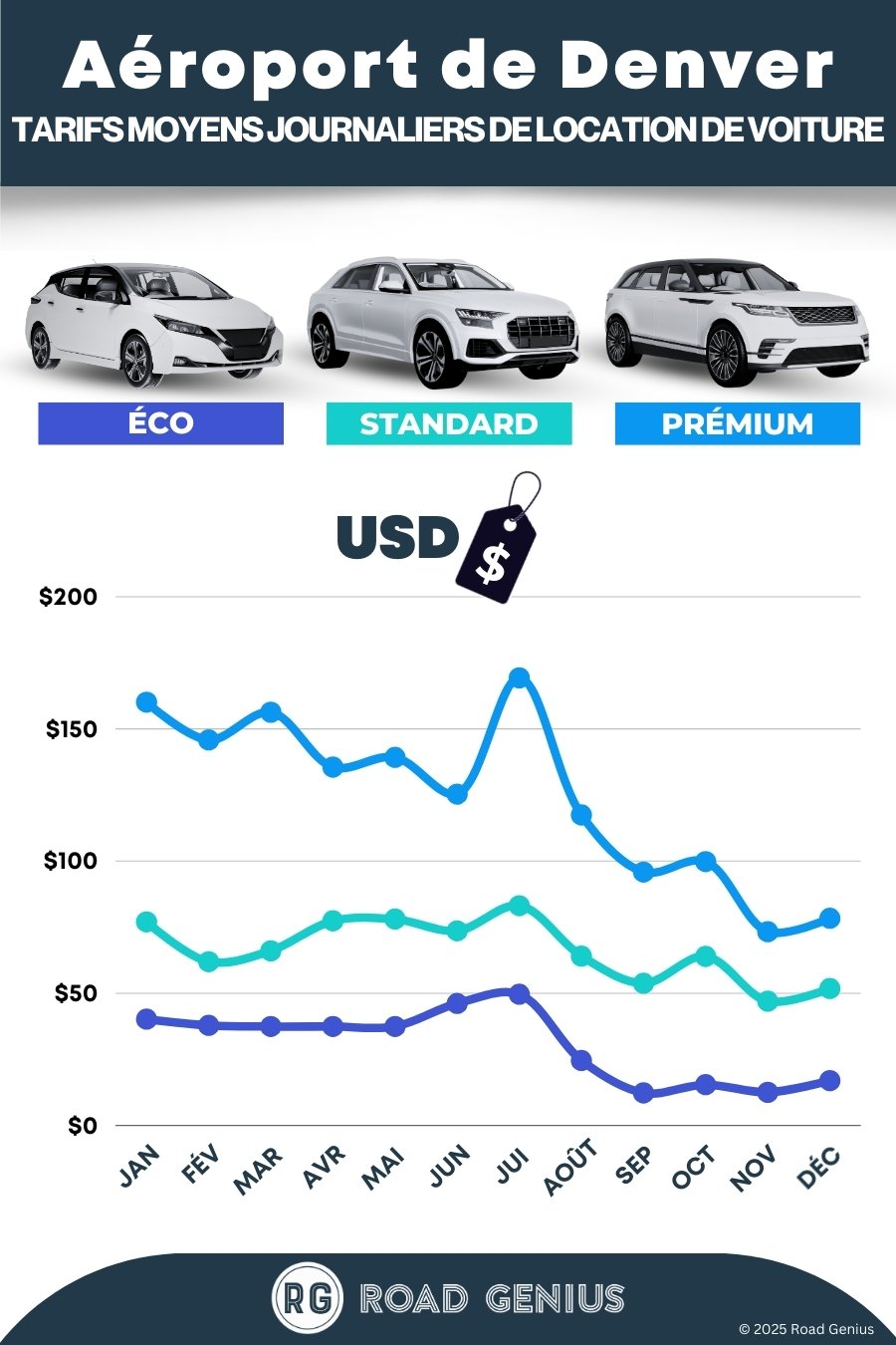 En moyenne, la location de voiture à l’aéroport de Denver coûte environ 74 USD par jour, les offres les moins chères étant disponibles dès 12 USD par jour.
