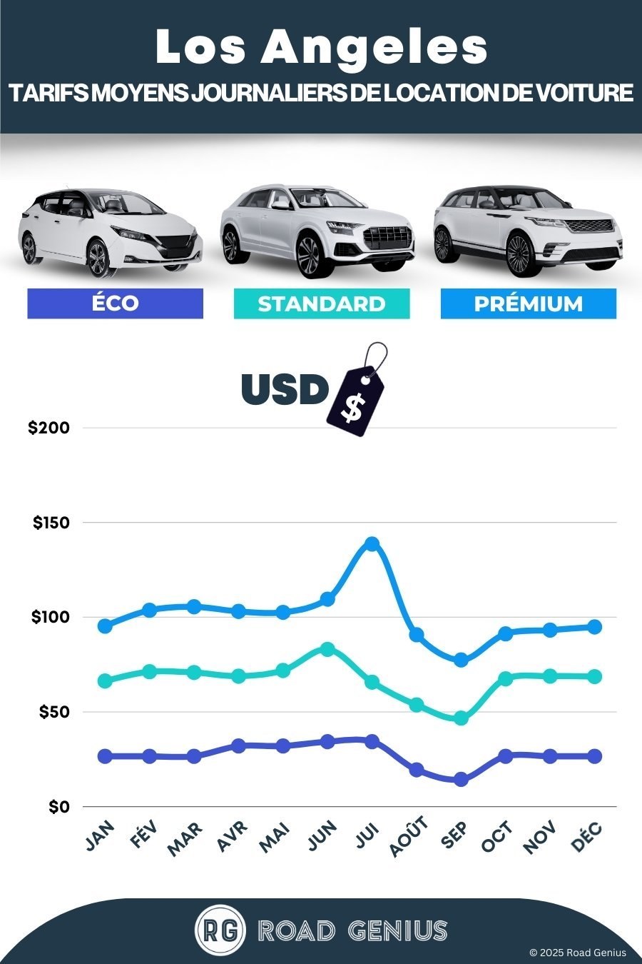 En moyenne, la location de voiture à Los Angeles coûte environ 65 USD par jour, les offres les moins chères étant disponibles à partir de 14 USD par jour.