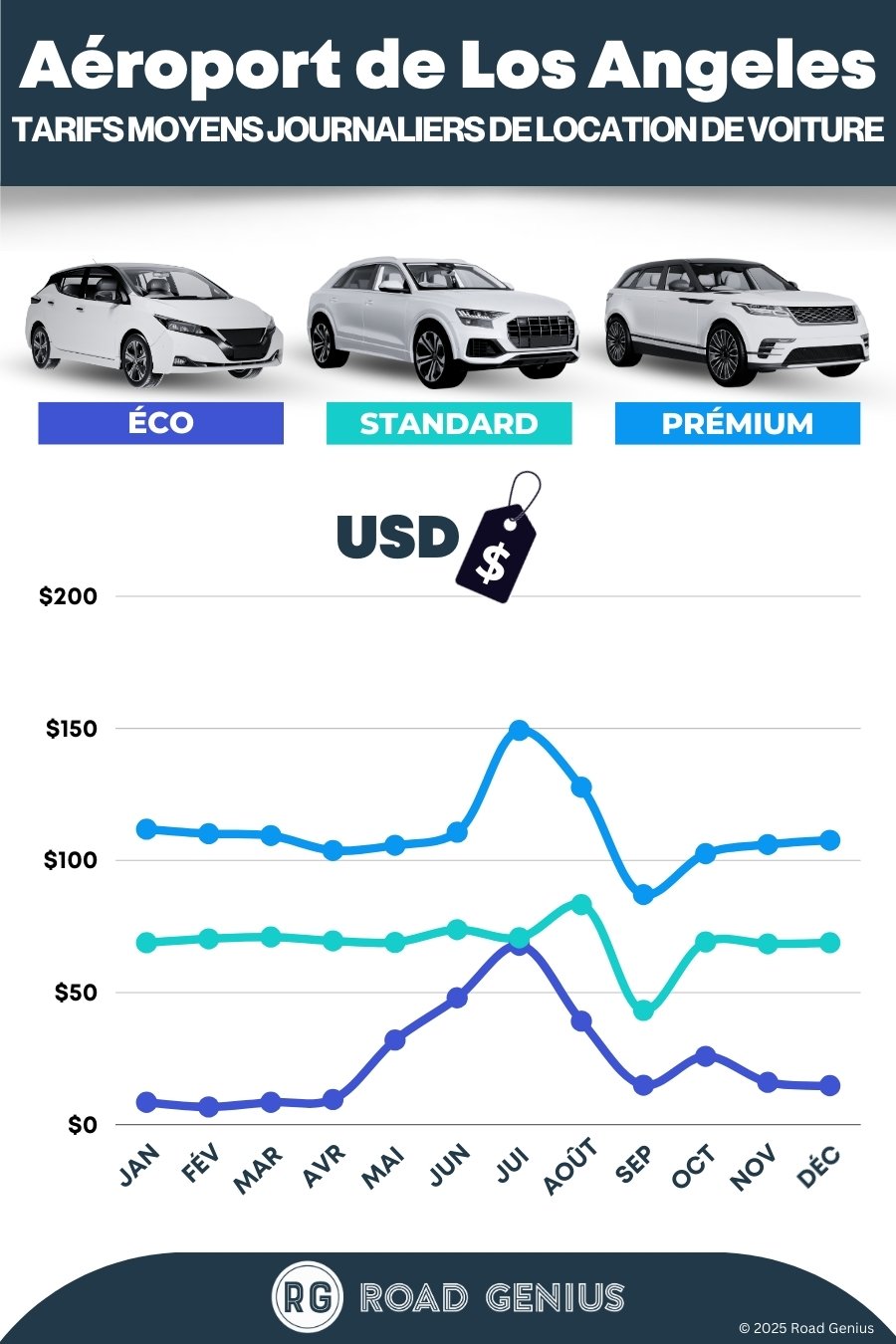 En moyenne, la location de voiture à l’aéroport de Los Angeles coûte environ 68 USD par jour, les offres les moins chères étant disponibles dès 7 USD par jour.