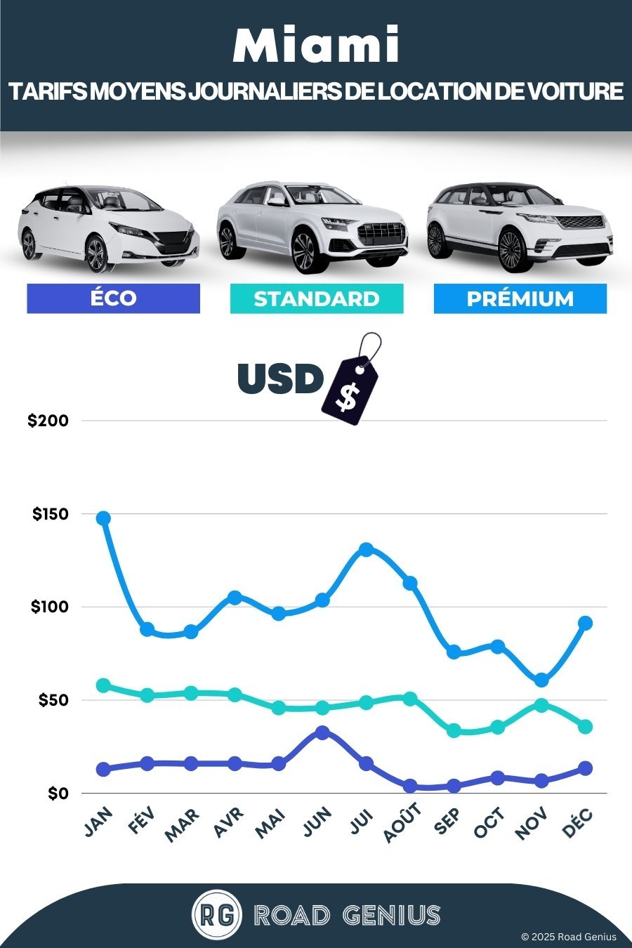 En moyenne, la location de voiture à Miami coûte environ 53 USD par jour, les offres les moins chères étant disponibles dès 4 USD par jour.