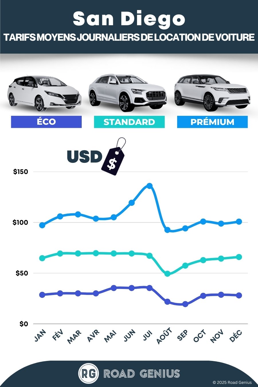 En moyenne, la location de voiture à San Diego coûte environ 66 USD par jour, les offres les moins chères étant disponibles dès 19 USD par jour.