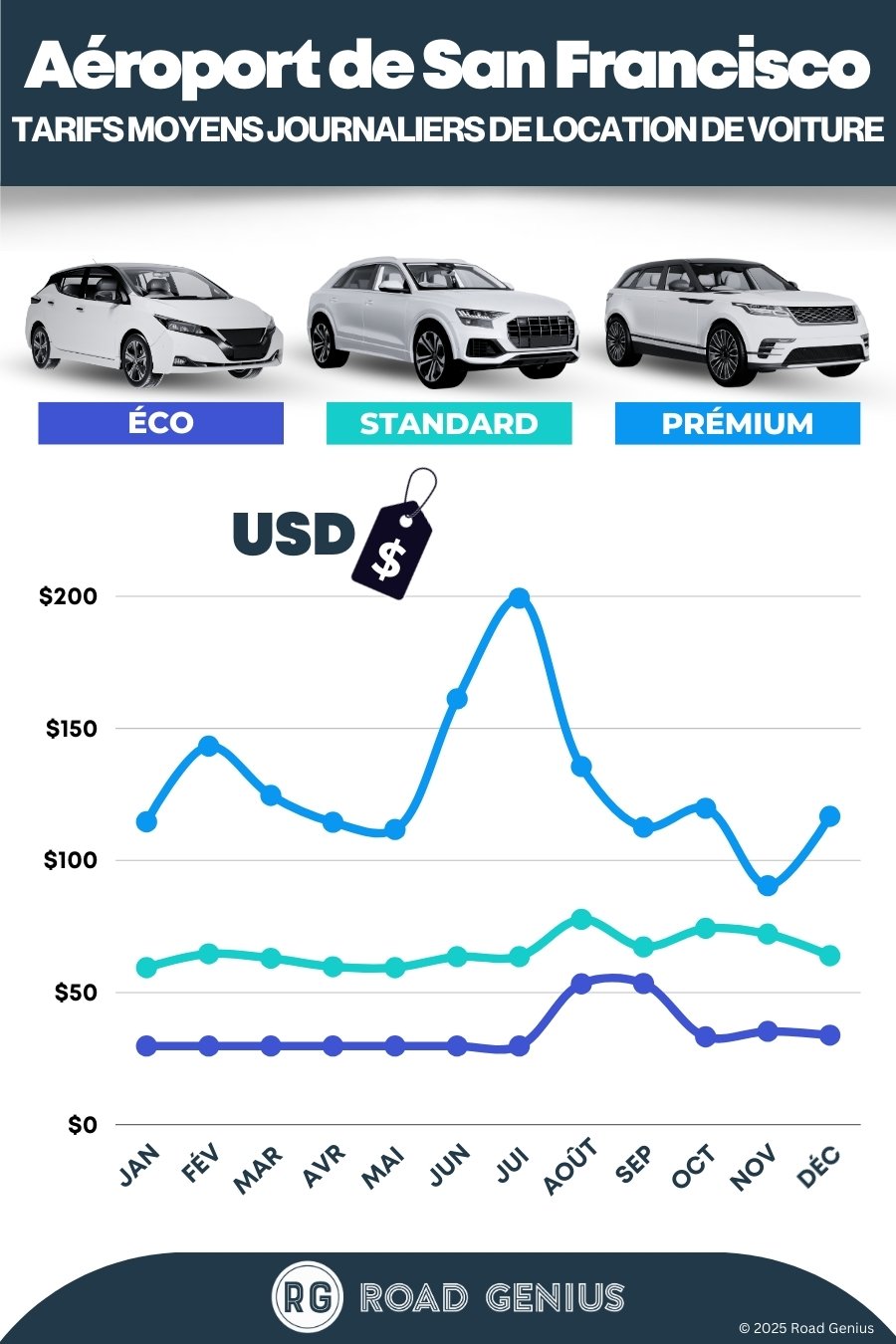 En moyenne, la location de voiture à l’aéroport de San Francisco coûte environ 76 USD par jour, les offres les moins chères étant disponibles dès 30 USD par jour.