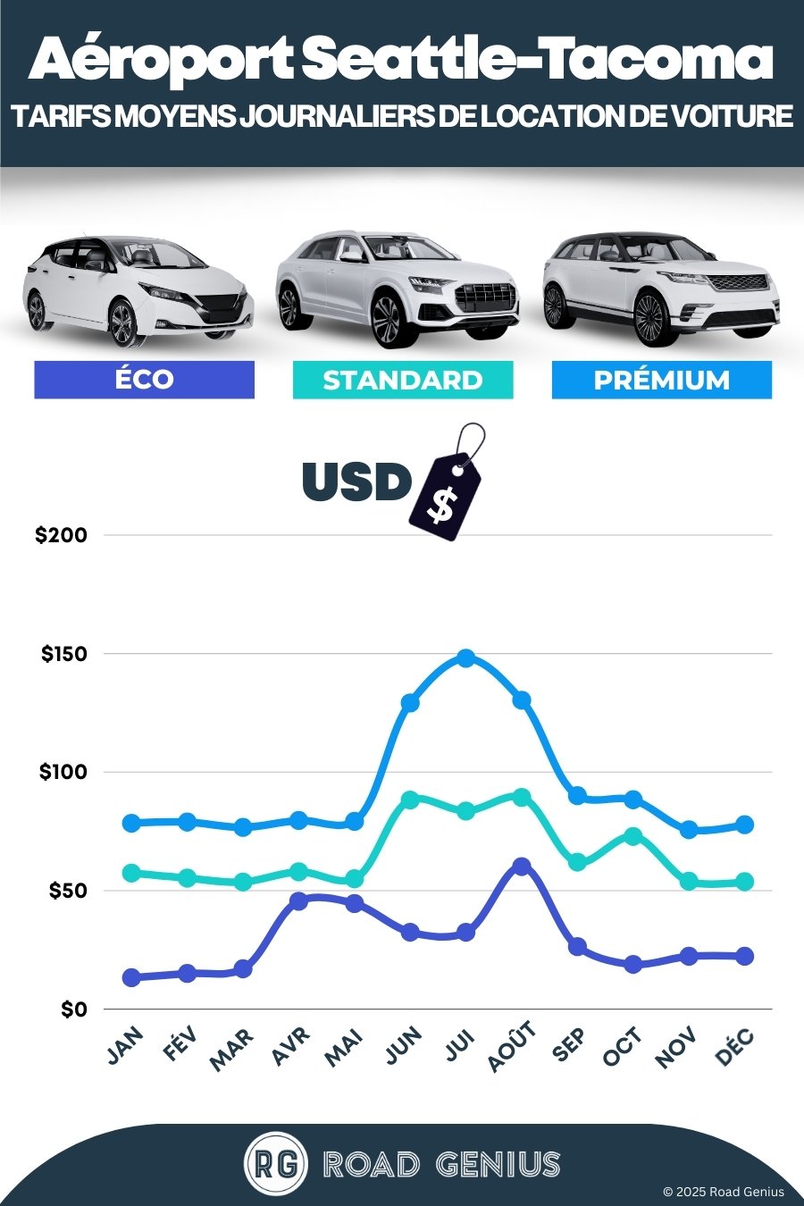 En moyenne, la location de voiture à l’aéroport de Seattle-Tacoma coûte environ 63 USD par jour, les offres les moins chères étant disponibles dès 13 USD par jour.