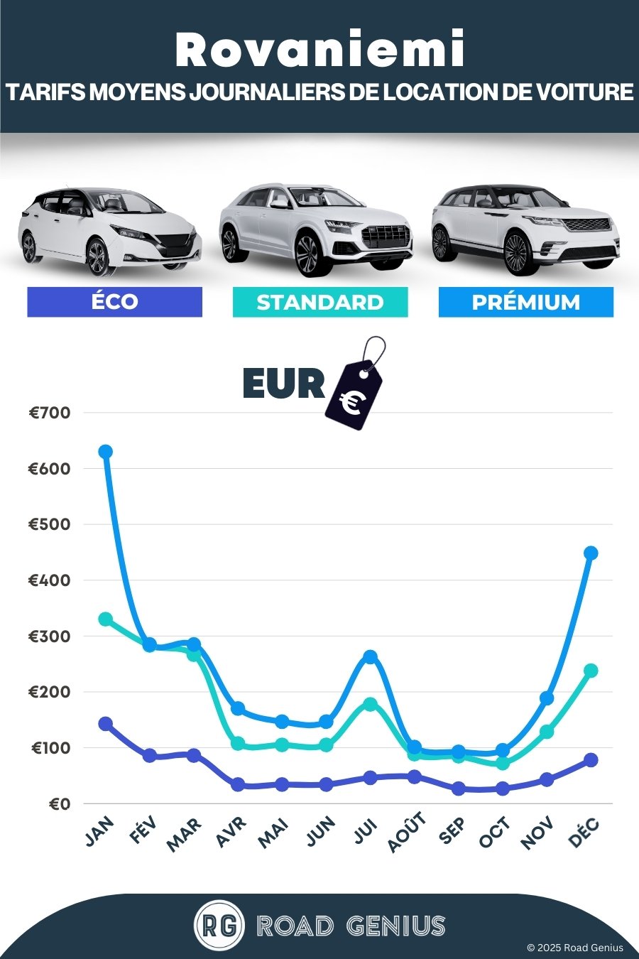 En moyenne, la location de voiture à Rovaniemi coûte environ 153 € par jour, les offres les moins chères étant disponibles dès 27 € par jour.