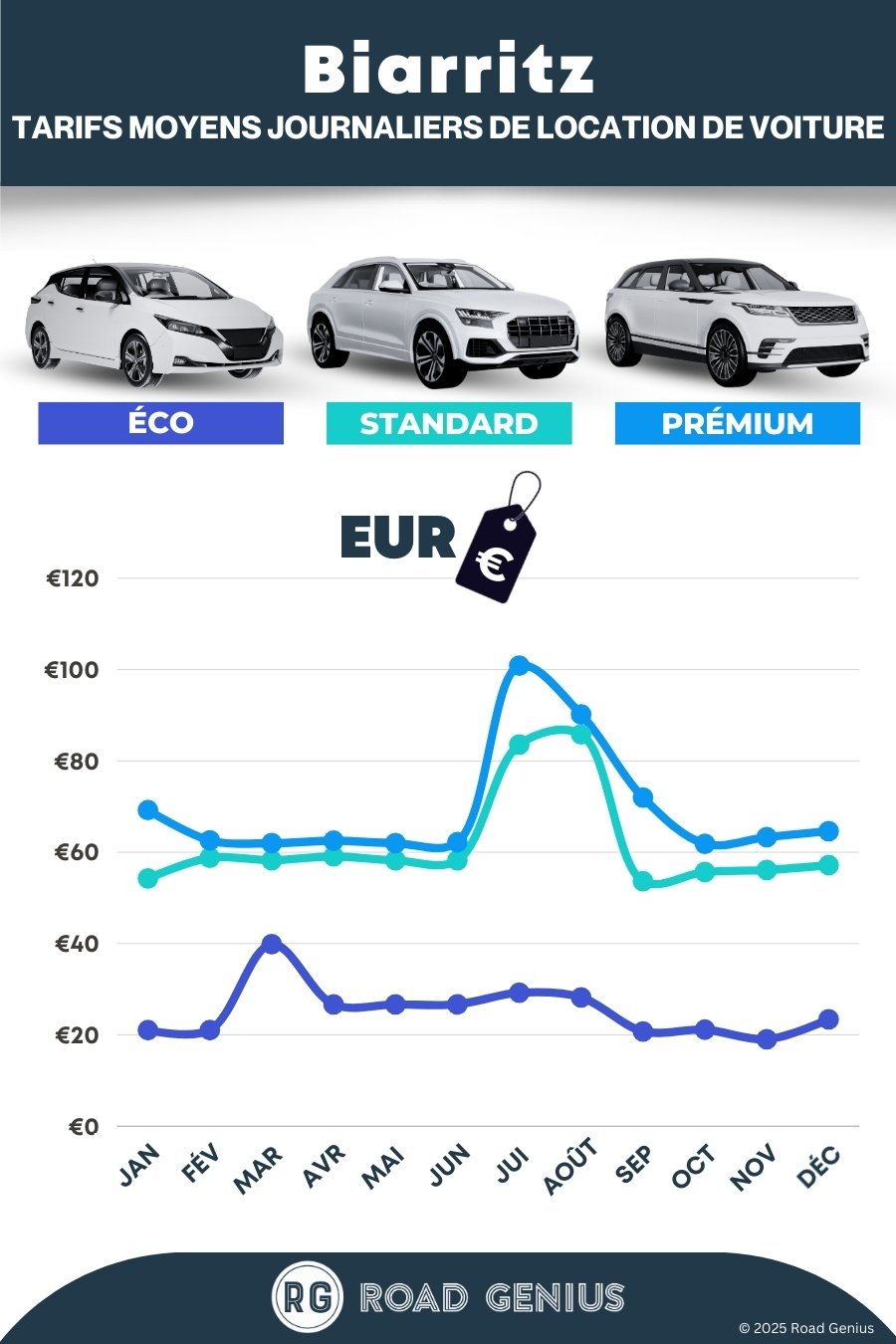 En moyenne, la location de voiture à Biarritz coûte environ 53 € par jour, les offres les moins chères étant disponibles dès 16 € par jour.