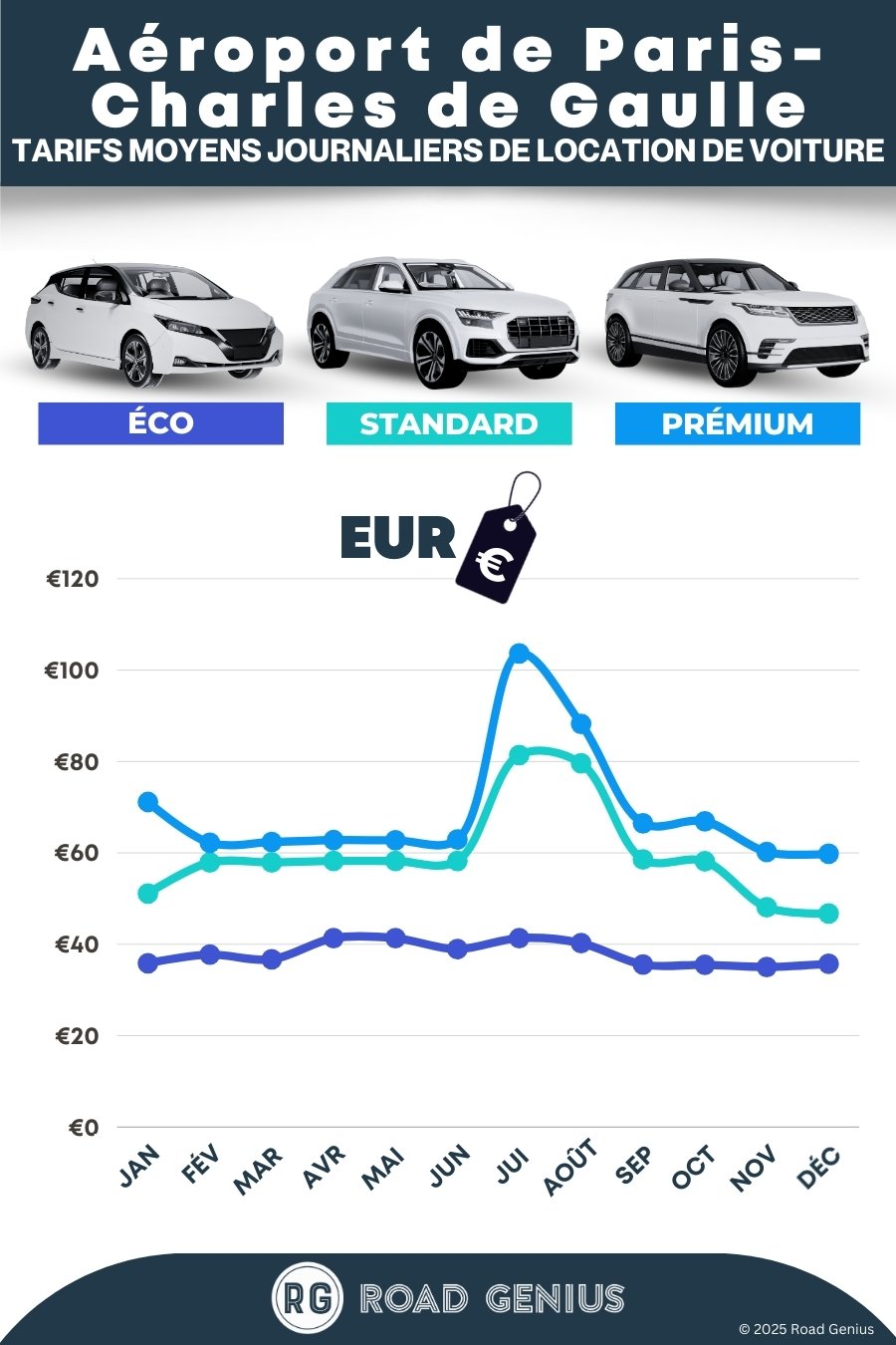 En moyenne, la location de voiture à l’aéroport Paris-Charles-de-Gaulle coûte environ 56 € par jour, les offres les moins chères étant disponibles dès 35 € par jour.