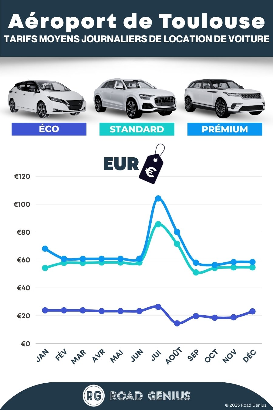 En moyenne, la location de voiture à Toulouse Airport coûte environ 49 € par jour, les offres les moins chères étant disponibles dès 15 € par jour.