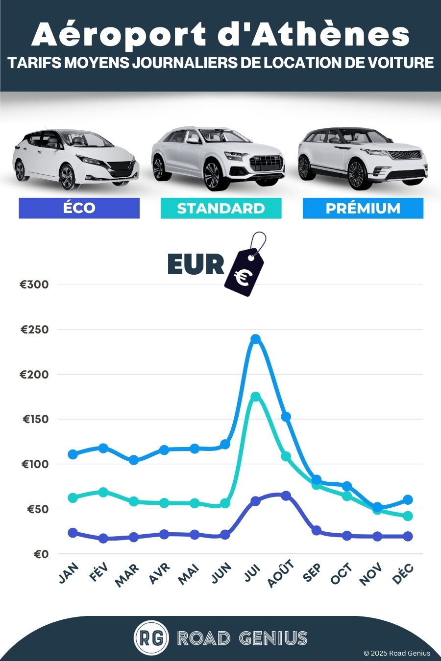 En moyenne, la location de voiture à Athens Airport coûte environ 71 € par jour, les offres les moins chères étant disponibles dès 17 € par jour.