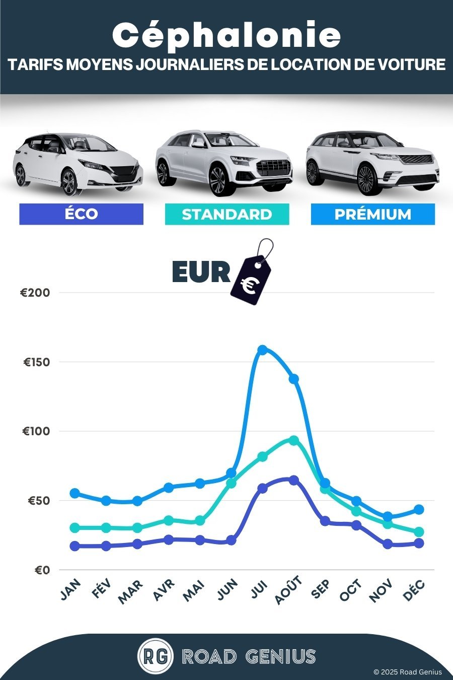 En moyenne, la location de voiture à Kefalonia coûte environ 48 € par jour, les offres les moins chères étant disponibles dès 17 € par jour.