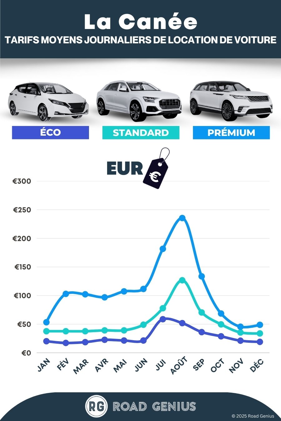 En moyenne, la location de voiture à Chania coûte environ 63 € par jour, les offres les moins chères étant disponibles dès 17 € par jour.