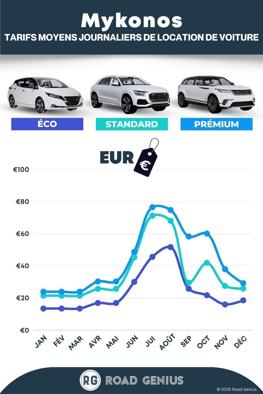 En moyenne, la location de voiture à Mykonos coûte environ 34 € par jour, les offres les moins chères étant disponibles dès 13 € par jour.