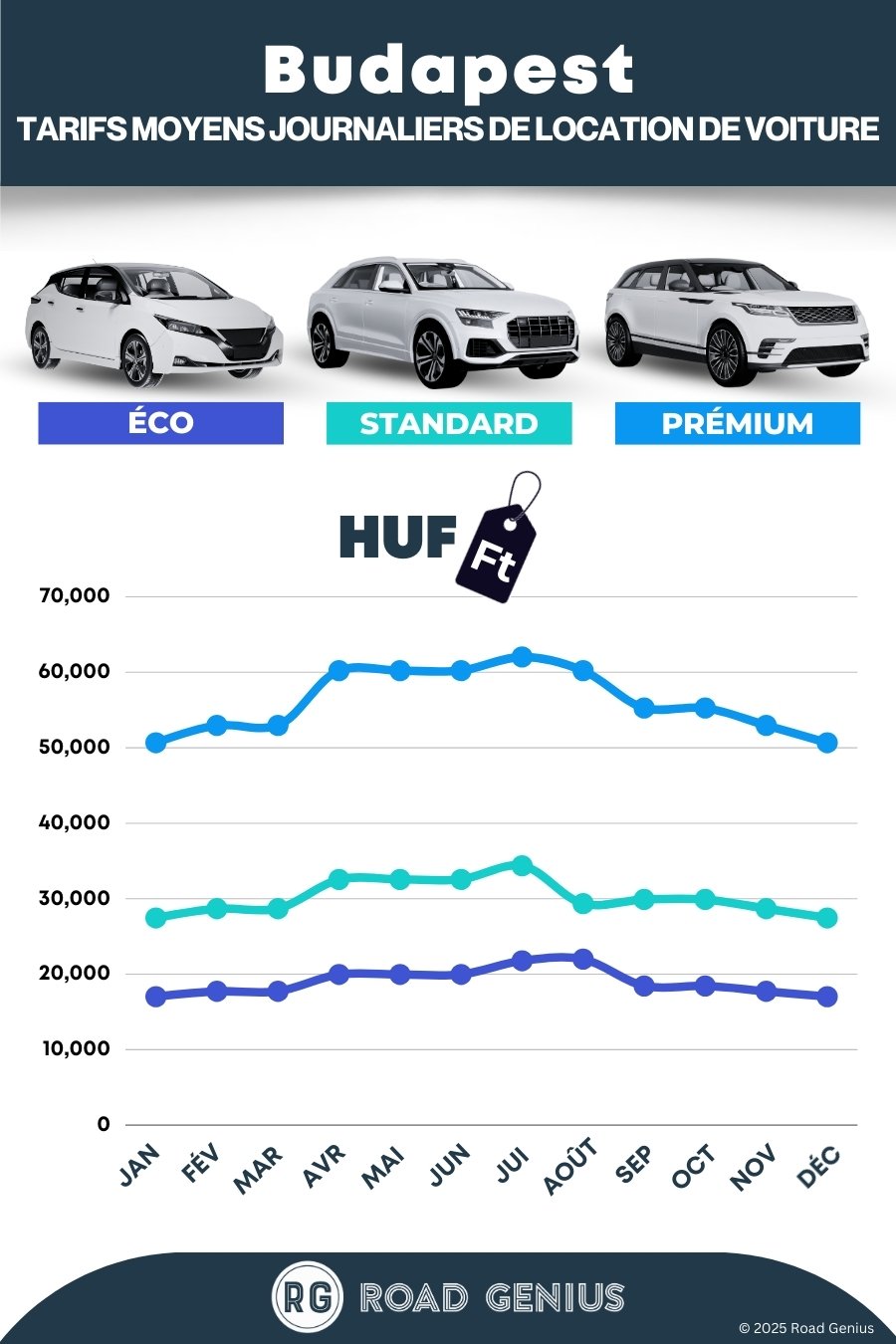 En moyenne, la location de voiture à Budapest coûte environ 35 103 HUF par jour, les offres les moins chères étant disponibles dès 17 023 HUF par jour.