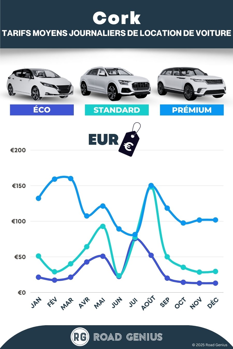 En moyenne, la location de voiture à Cork coûte environ 68 € par jour, les offres les moins chères étant disponibles dès 13 € par jour.