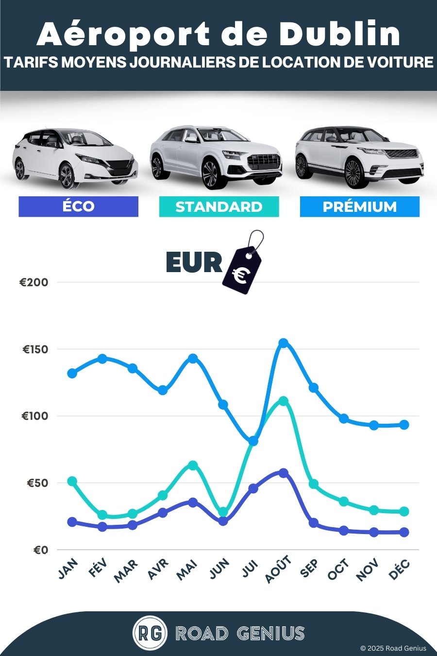En moyenne, la location de voiture à Dublin Airport coûte environ 64 € par jour, les offres les moins chères étant disponibles dès 13 € par jour.