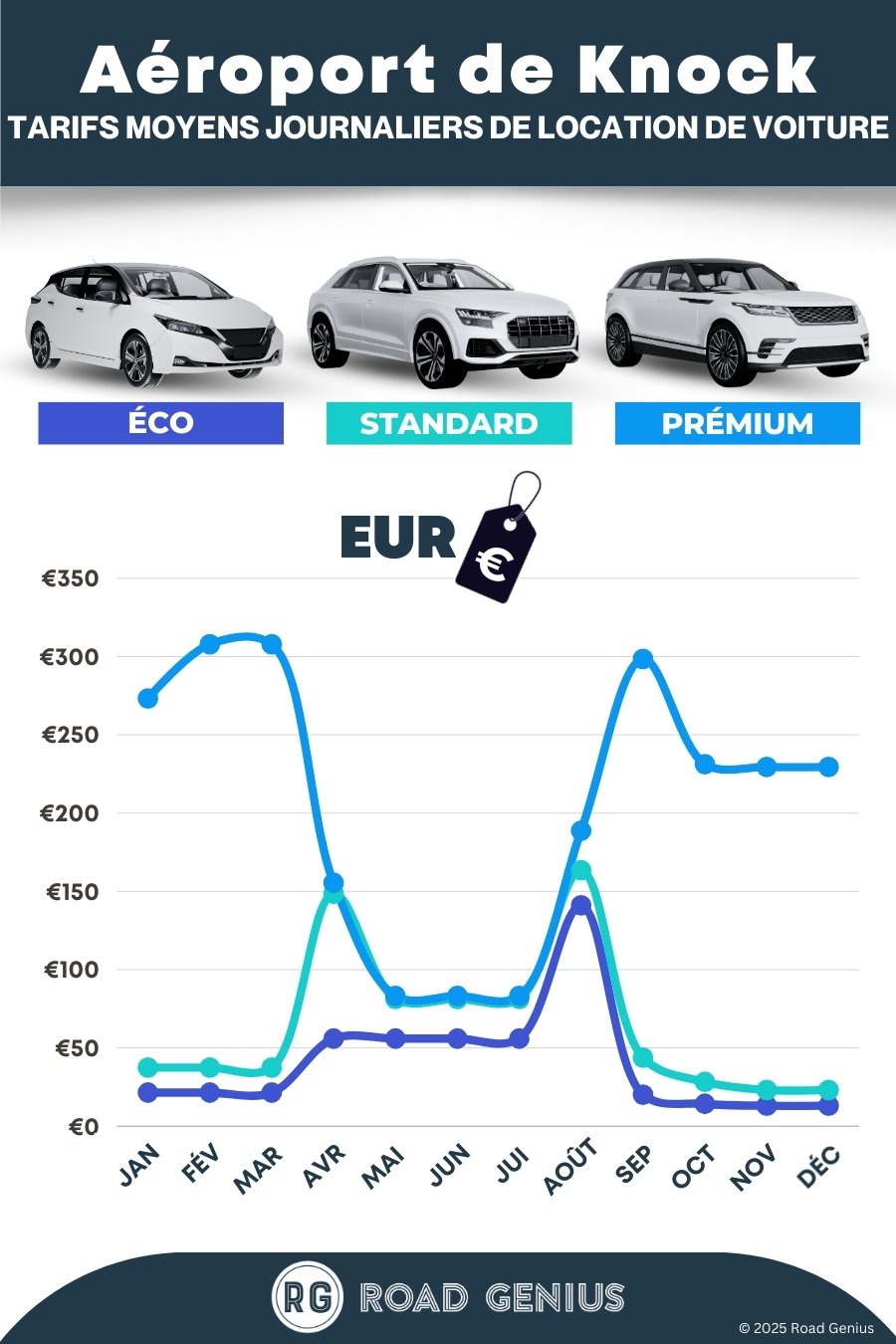En moyenne, la location de voiture à Knock Airport coûte environ 104 € par jour, les offres les moins chères étant disponibles dès 13 € par jour.