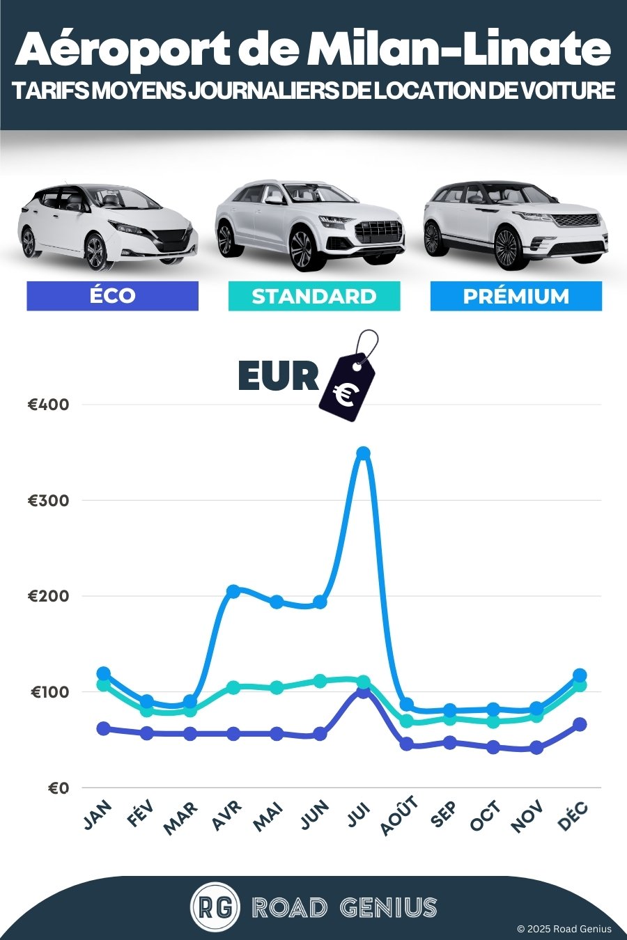 En moyenne, la location de voiture à Milan Linate Airport coûte environ 96 € par jour, les offres les moins chères étant disponibles dès 42 € par jour.