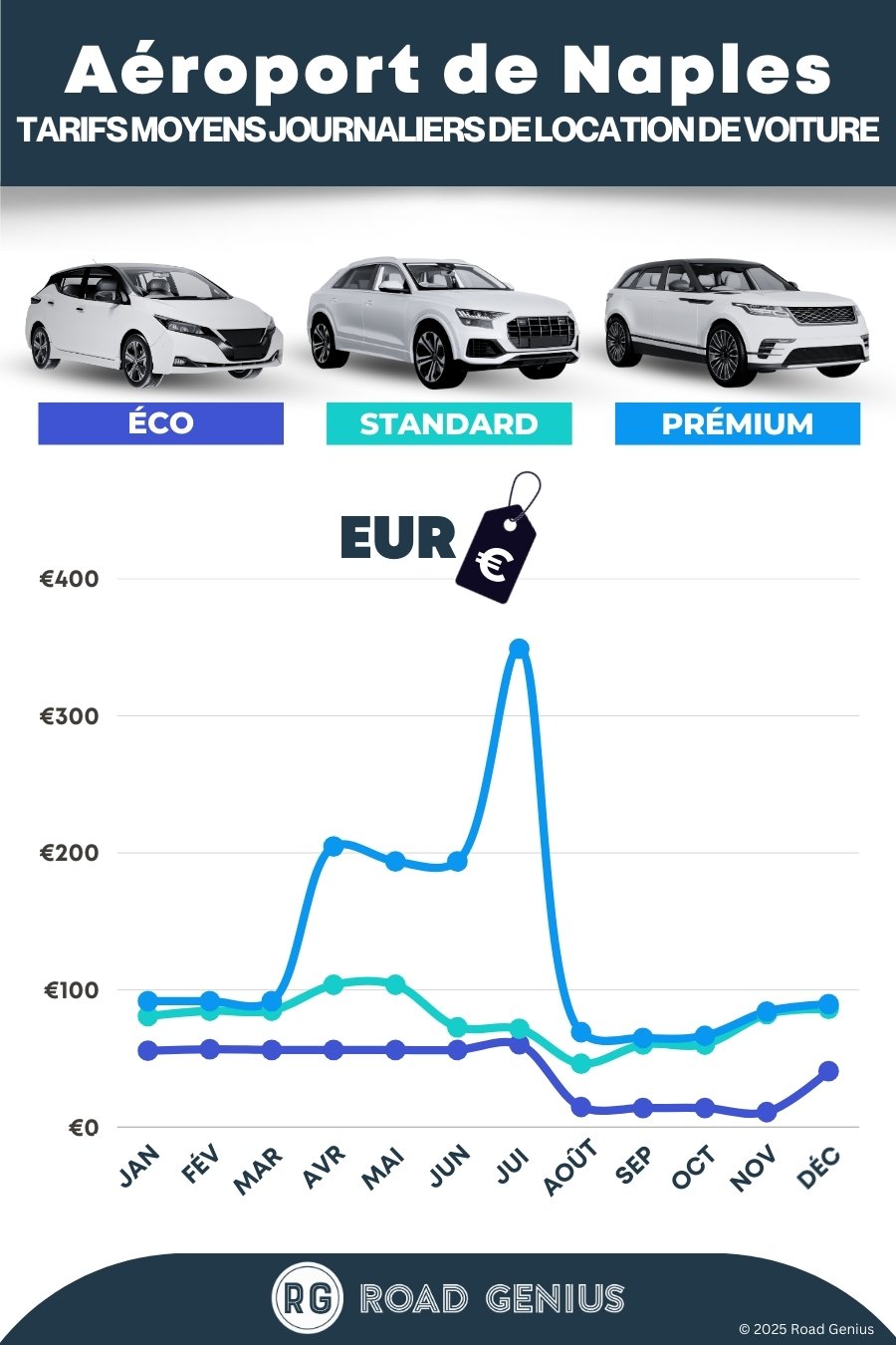En moyenne, la location de voiture à Naples Airport coûte environ 84 € par jour, les offres les moins chères étant disponibles dès 11 € par jour.