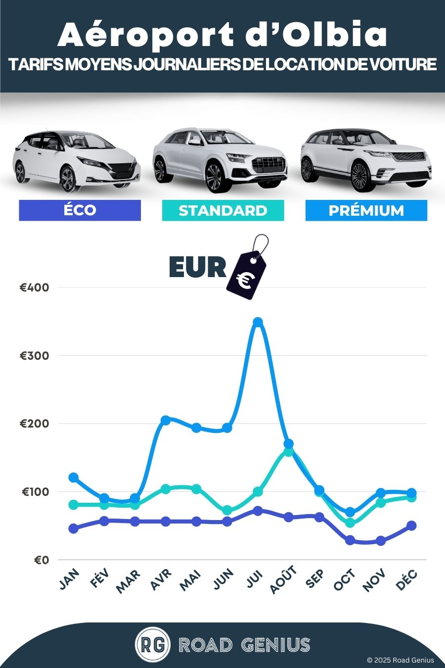 Comparez les loueurs et les catégories de véhicules à l'aéroport d'Olbia ; les prix varient souvent de 10 à 20 % pour des voitures similaires.