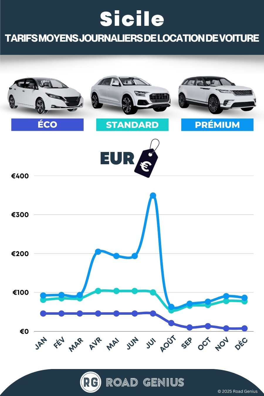En moyenne, la location de voiture en Sicile coûte environ 83 € par jour, les offres les moins chères étant disponibles dès 8 € par jour.