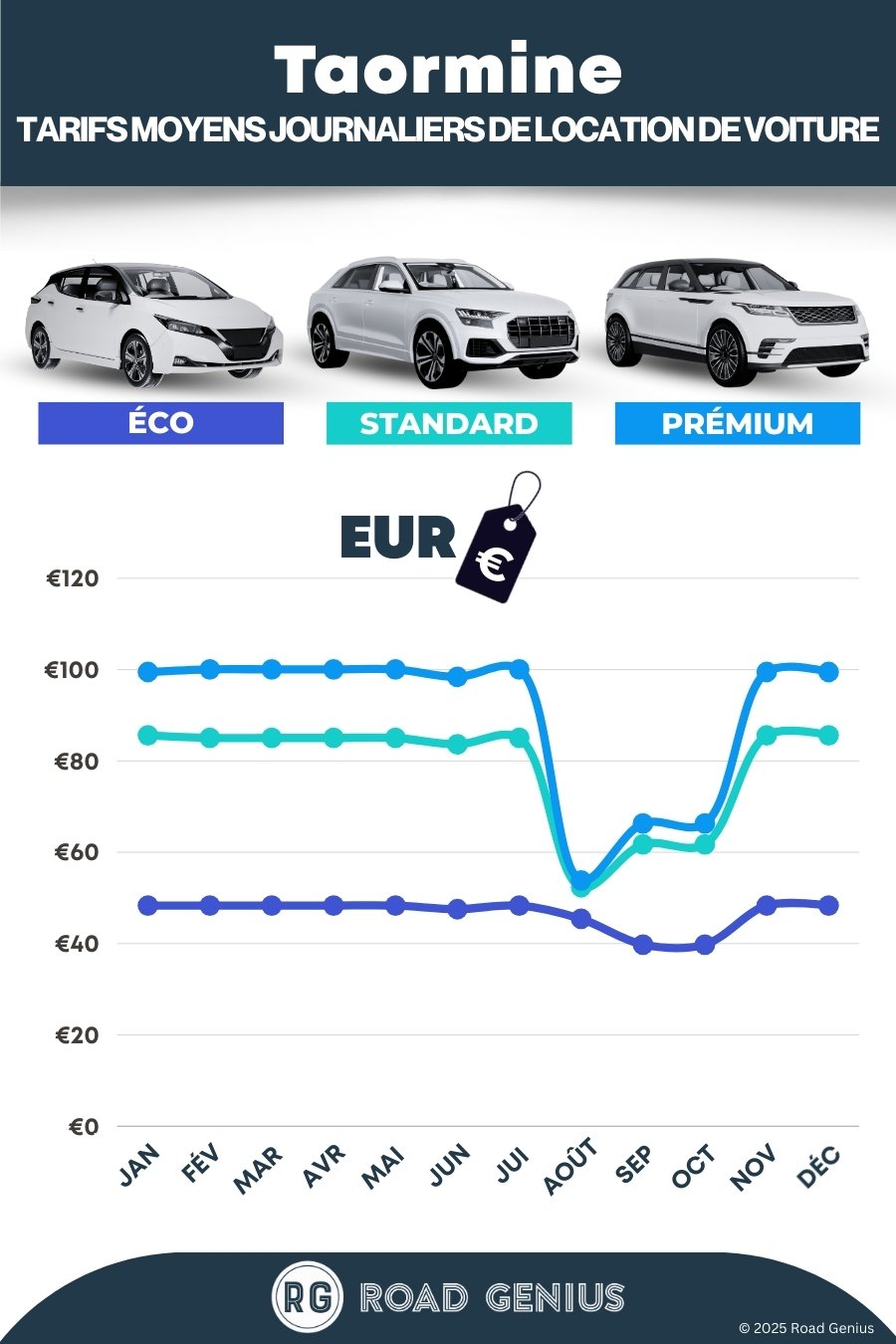En moyenne, la location de voiture à Taormina coûte environ 72 € par jour, les offres les moins chères étant disponibles dès 40 € par jour.