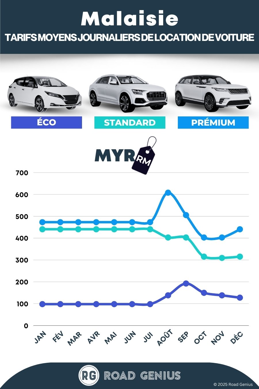 En moyenne, la location de voiture en Malaisie coûte environ 331 MYR par jour, les offres les moins chères étant disponibles dès 98 MYR par jour.