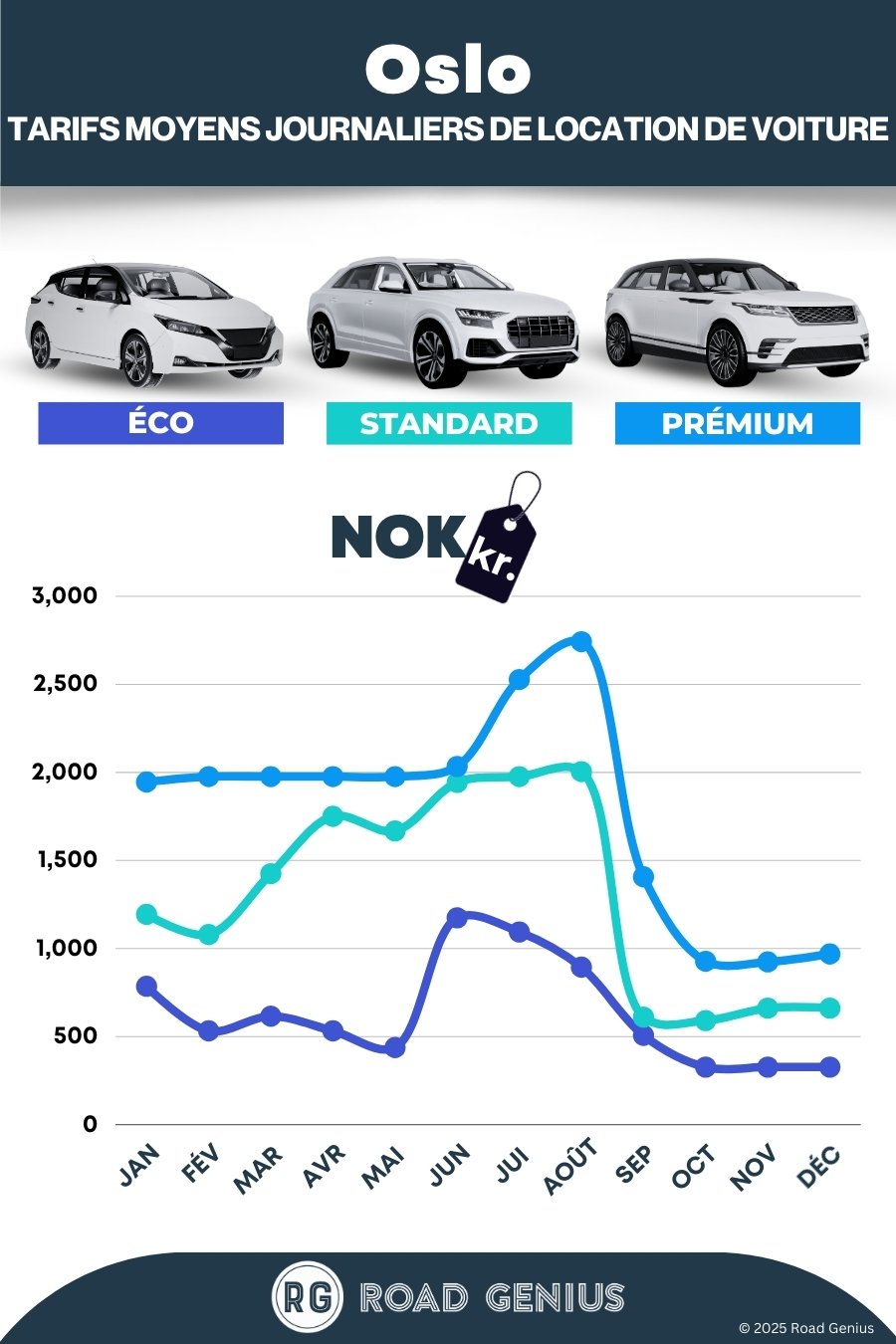 En moyenne, la location de voiture à Oslo coûte environ 1 236 kr par jour, les offres les moins chères étant disponibles dès 327 kr par jour.