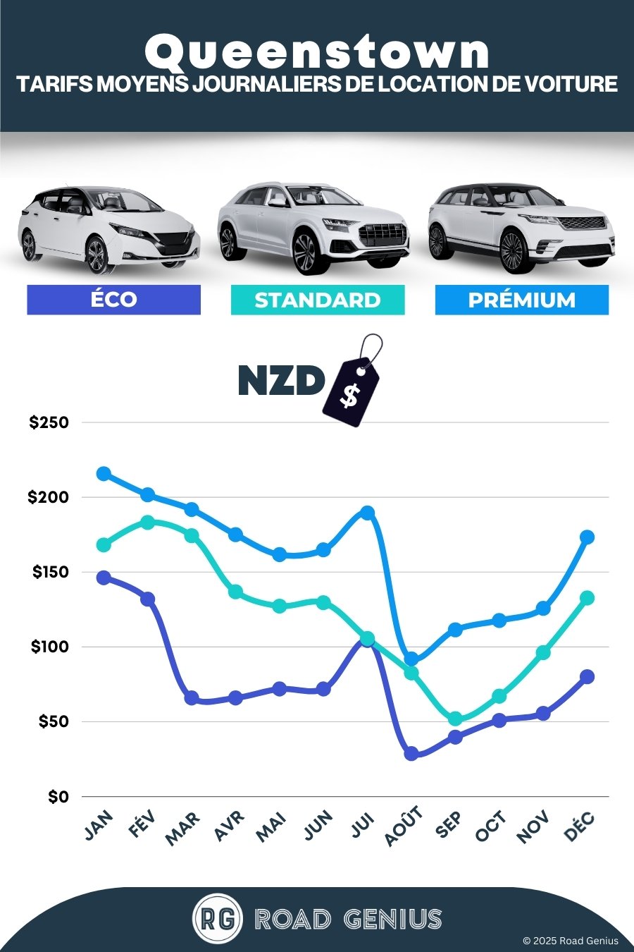 En moyenne, la location de voiture à Queenstown coûte environ 119 NZD par jour, les offres les moins chères étant disponibles dès 29 NZD par jour.