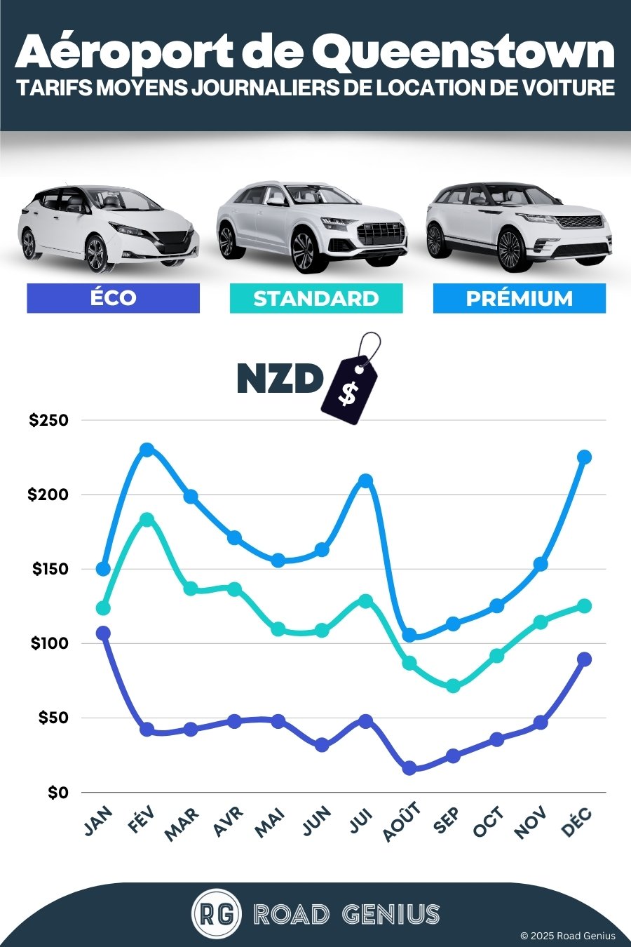 En moyenne, la location de voiture à l’aéroport de Queenstown coûte environ 111 NZD par jour, les offres les moins chères étant disponibles dès 16 NZD par jour.