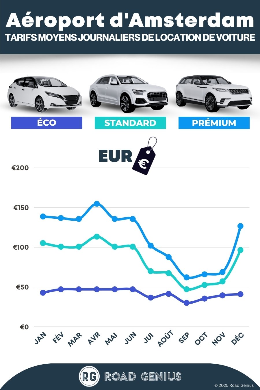 En moyenne, la location de voiture à l’aéroport d’Amsterdam coûte environ 80 € par jour, les offres les moins chères étant disponibles dès 30 € par jour.