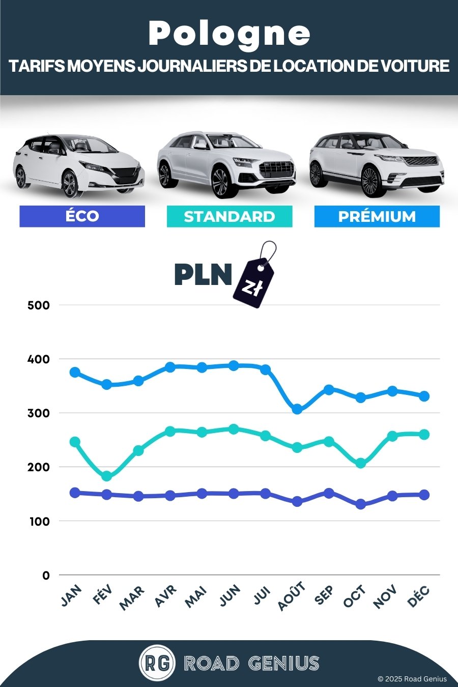 En moyenne, la location de voiture en Pologne coûte environ 249 zł par jour, les offres les moins chères étant disponibles dès 131 zł par jour.