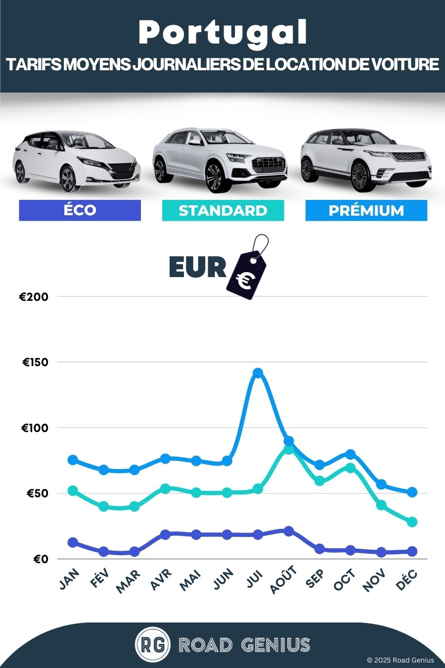 En moyenne, la location de voiture au Portugal coûte environ 47 € par jour, les offres les moins chères étant disponibles dès 5 € par jour.