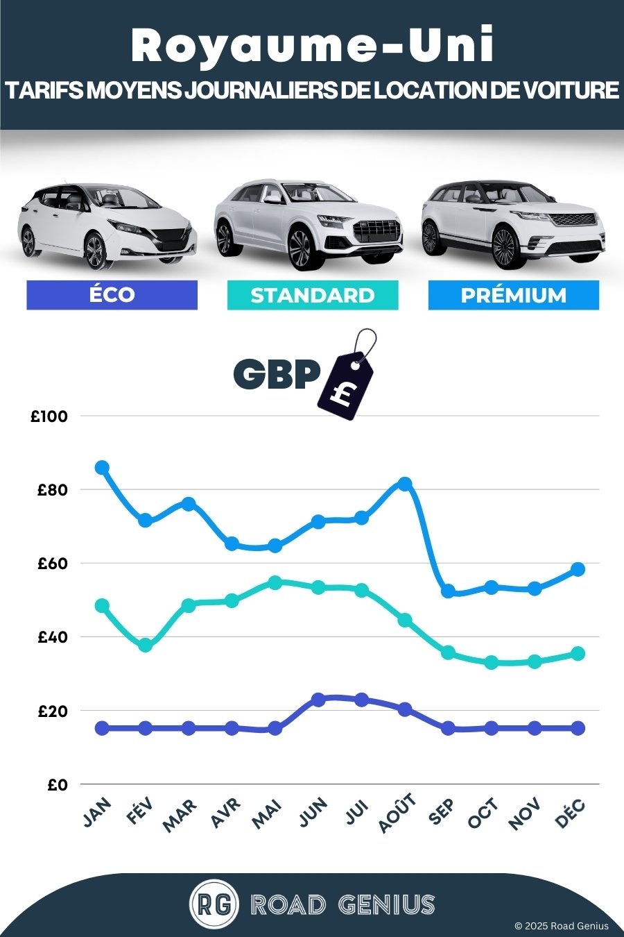 En moyenne, la location de voiture au Royaume-Uni coûte environ 43 € par jour, les offres les moins chères étant disponibles dès 15 € par jour.