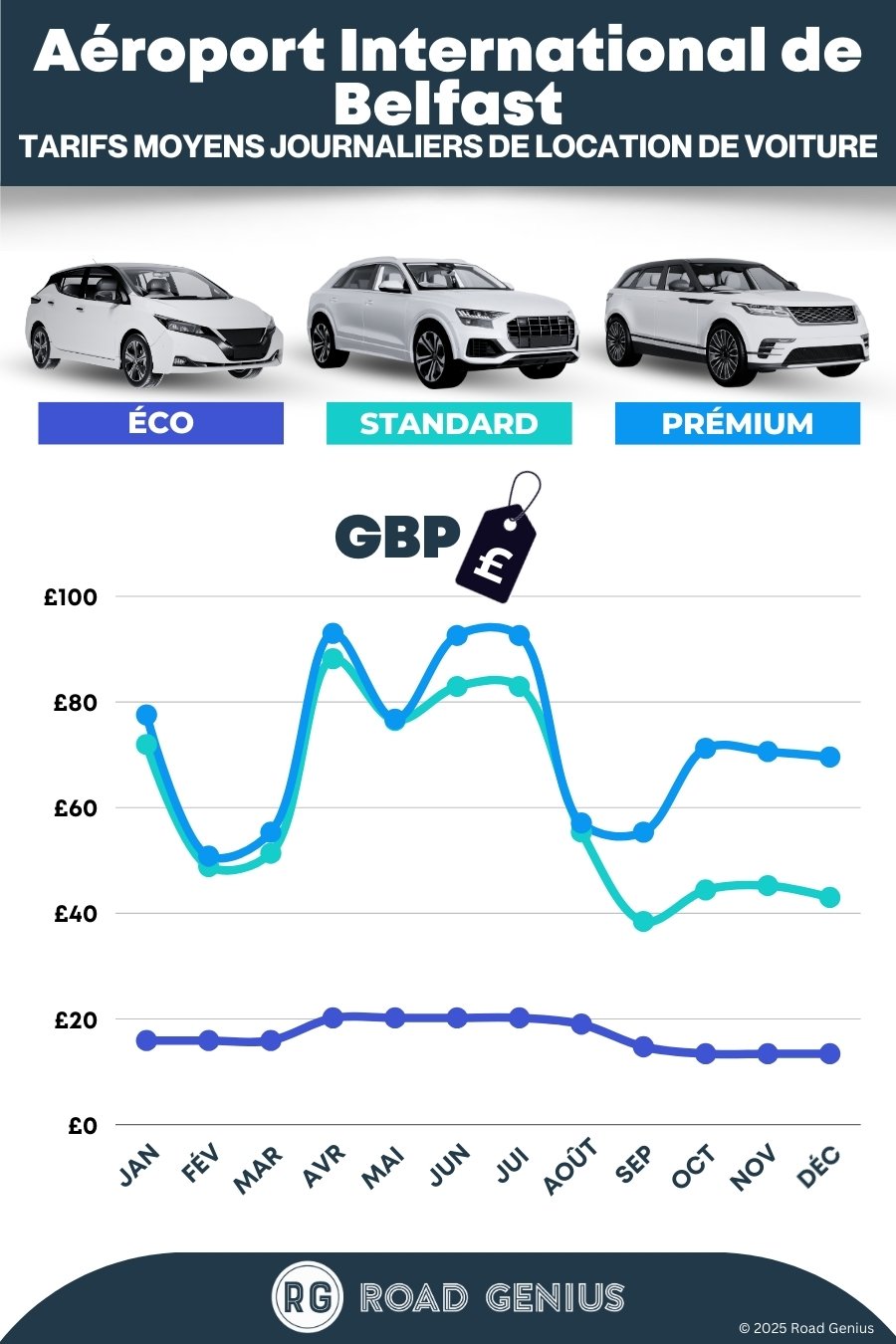 En moyenne, la location de voiture à l’aéroport international de Belfast coûte environ 50 € par jour, les offres les moins chères étant disponibles dès 13 € par jour.