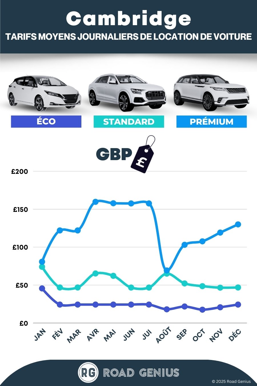 En moyenne, la location de voiture à Cambridge coûte environ 67 € par jour, les offres les moins chères étant disponibles dès 18 € par jour.