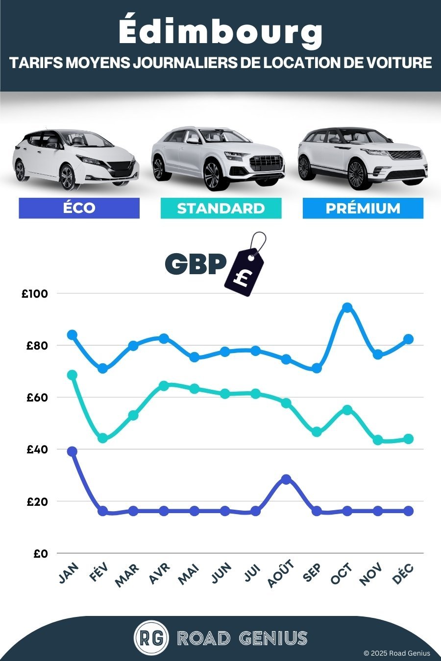 En moyenne, la location de voiture à Édimbourg coûte environ 51 € par jour, les offres les moins chères étant disponibles dès 16 € par jour.