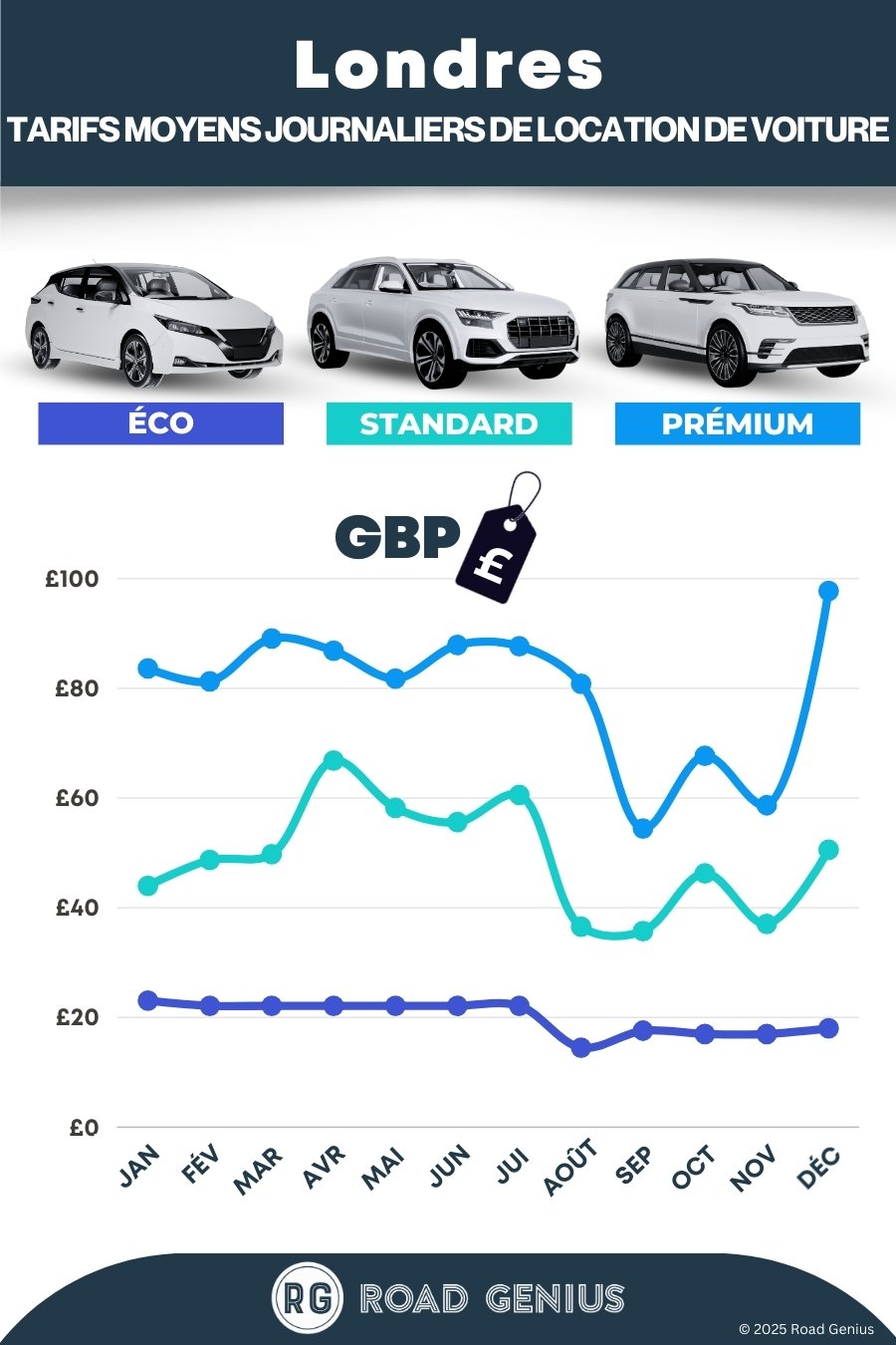 En moyenne, la location de voiture à Londres coûte environ £50 par jour, les offres les moins chères étant disponibles dès £14 par jour.