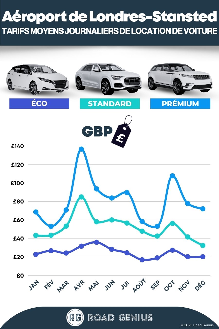 Choisissez la bonne catégorie de véhicule : les voitures compactes à boîte manuelle sont moins chères et plus faciles à garer. À Stansted, une boîte automatique coûte généralement 10 à 15 GBP de plus par jour.